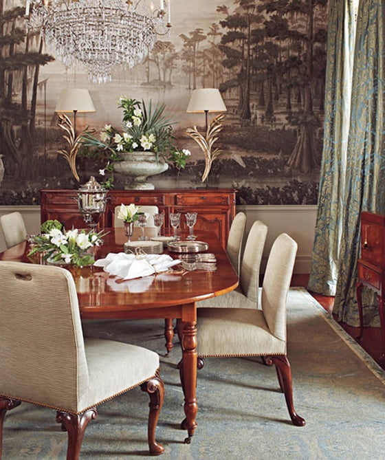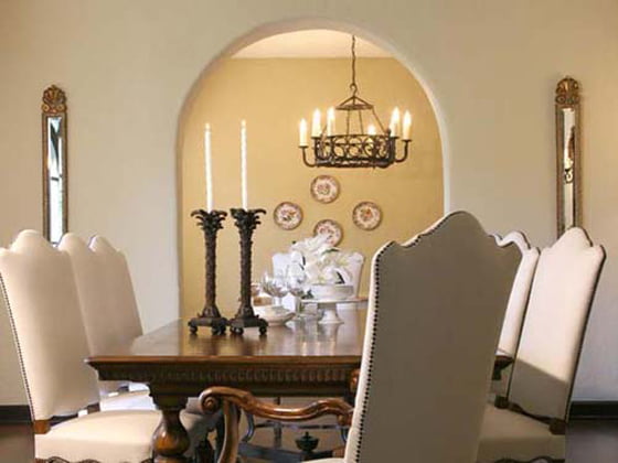 Một phong cách phòng ăn rất Châu Âu, mang một vẻ đẹp cổ điển, tôn lên nét sang trọng, quý phải cho phòng ăn. Hơn nữa, nó thể hiện được đẳng cấp của gia chủ với những nội thất đắt tiền bày trí ở đó. Phòng ăn như đưa ta đến với một thế giới cổ điển xưa từ bộ bàn ăn đến tranh treo tường và hệ đẹp chùm đẹp lung linh.