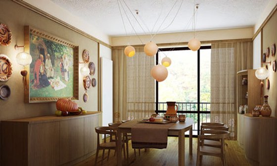Theo kiểu thiết kế nội thất truyền thống, phòng ăn được bố trí theo dạng không gian mở và cạnh phòng khách. Bạn cũng nên trang trí phòng ăn phù hợp với không gian kiến trúc chung của căn hộ. Lấy bàn ăn làm vật trung tâm và chú ý cách phối hợp màu sắc giữa đồ dùng và tường nhà để không gian hài hòa, trang nhã. Tránh việc sử dụng quá nhiều màu đậm, gây nhức mắt.
